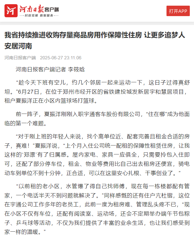 省住房城鄉建設廳相關負責人表示,將持續加大保障性租賃住房籌措建設力度,著力構建多層次租賃住房供應體系,加快推進收購存量商品房,用好專項債、保障性住房再貸款等資金,以河南鐵建投集團、中豫建投等省屬國企為抓手,帶動地方國企加快收購存量房用于保障性住房,助力解決青年人、新市民和工薪群體剛性住房需求。